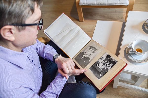 Mikołaj Kułakowski prezentujący zdjęcia z rodzinnego archiwum